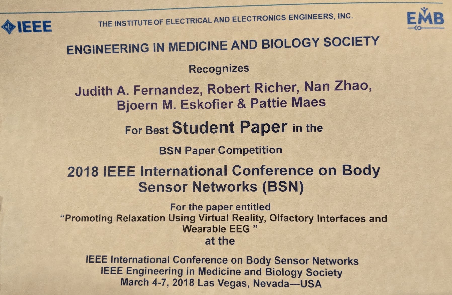 We are pleased to announce that our paper “Promoting Relaxation Using Virtual Reality, Olfactory Interfaces and Wearable EEG” by Judith Amores (MIT Media Lab) and Robert Richer (MaD Lab) won the Best Student Paper Award at the 2018 IEEE International Conference on Body Sensor Networks (BSN) in Las Vegas, USA! The work was done during Robert’s research stay at the MIT Media Lab last year and was funded by a DAAD FITweltweit scholarship.