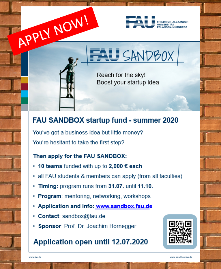 The application phase for the FAU Sandbox starts today ?! We are looking forward to many exciting ideas! Be part of it and boost your business this summer, the application period runs until 12.07.2020!