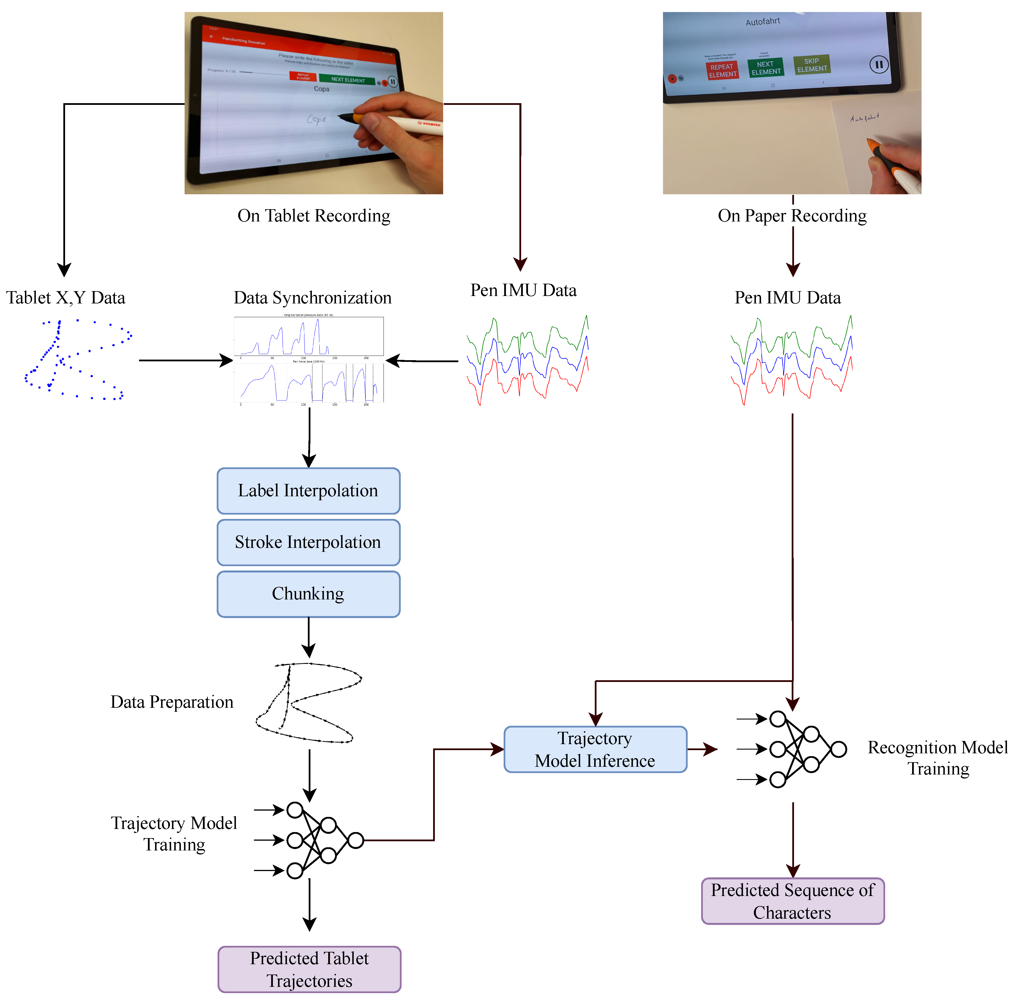 We developed the first end-to-end word trajectory reconstruction system for handwriting using inertial sensors. We trained a Convolutional Neural Network to retrace the movement of a digital pen on paper. Secondly, we trained a Convolutional Recurrent model for handwriting recognition, which achieved comparable results from the generated trajectories relative to the results achieved by the IMU data. Thirdly, we explored modeling the recognition system using both trajectory and IMU data inputs, which showed an improved recognition performance in comparison to the previously trained models.