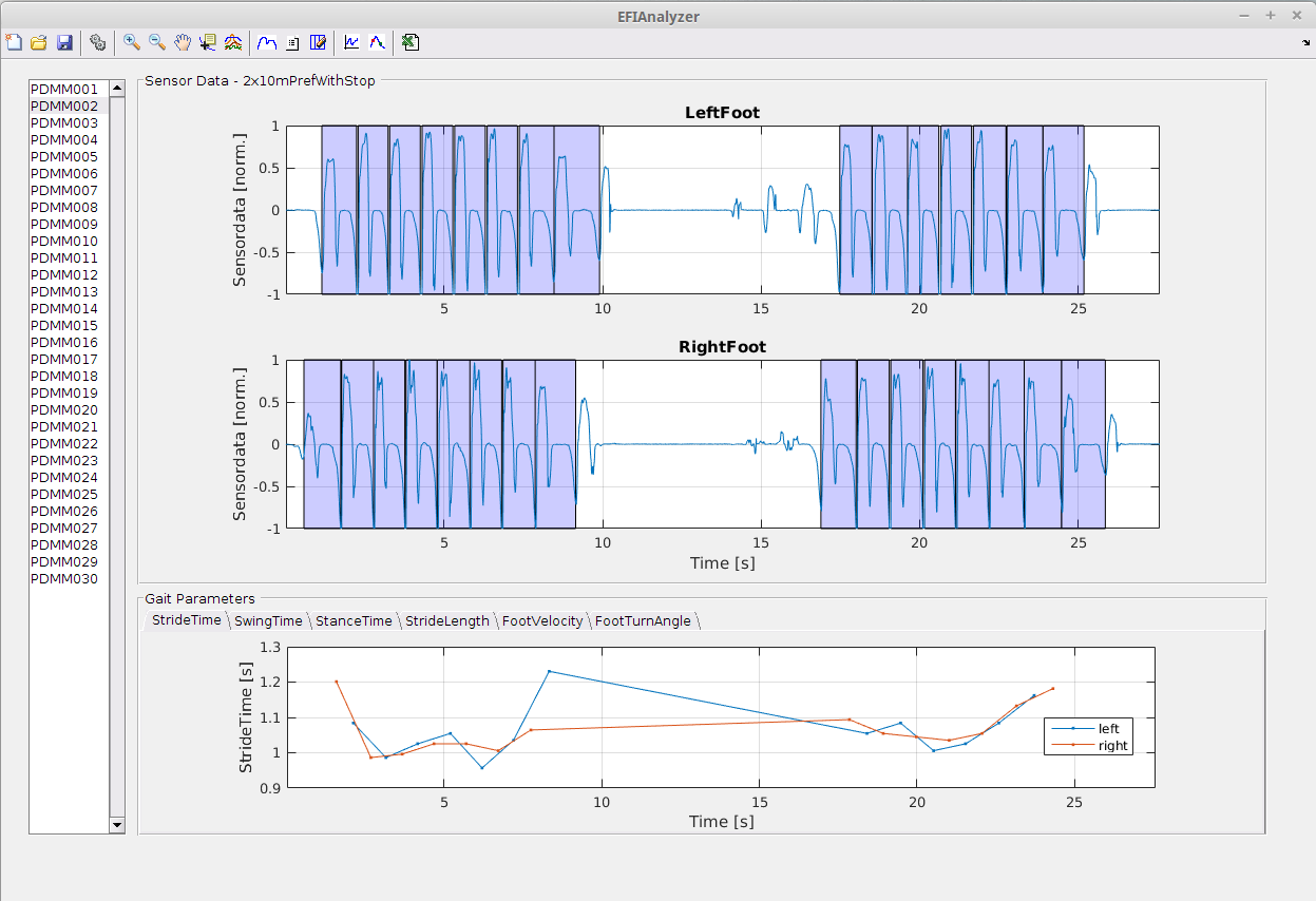 In the case of inertial sensor data from human gait, the prototypical application the toolbox is developed by, a set of biomechanical events (toe-off, heel-strike and mid-stance) can be extracted from the segmentation of continuous sensor data into strides. Furthermore, several biomechanical parameters can be extracted from the sensor trajectories for each stride (stride length, width etc.) or from the timings of individual gait events (stride, swing and stance time). In this respect, the toolbox also constitutes the code-base for the EFIMoves project and allows efficient deployment of graphical user interfaces that can be used in a clinical setting for advanced gait analysis.
