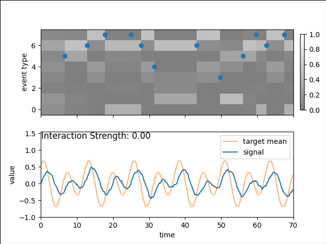 Mixed-Type time series synthesis for different intermodal interaction strengths between an event sequence and a set of superimposed sine waves.